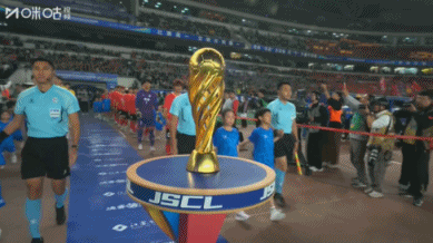 赛前,在主裁判马宁的率领下,双方球员入场,苏超冠军奖杯也亮相。↓
