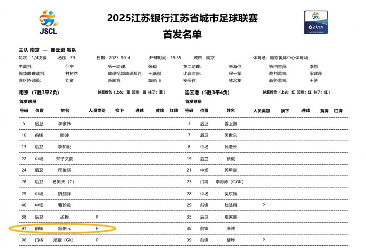 直播吧10月04日讯 “苏超”首场1/4淘汰赛,南京队对阵连云港队的首发已经公布,其中南京队派出了现效力于青岛海牛队的冯伯元首发出场。
